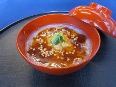 「うずみ」とは埋もれる・うずもれるという意味で、文字通り、豆腐がお粥の中にうずまっている料理です。今回はお粥をかけていますが、炊きたてのご飯や、蒸したもち米でも良いと思います。