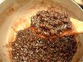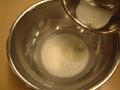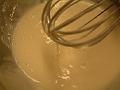 薄力粉が混ざれば、調節用の水を加えながら、泡立て器ですくって流れるくらいの固さに調節する。
