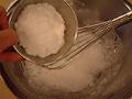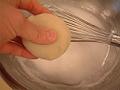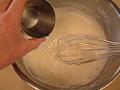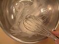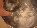 卵白をボウルに入れ、泡立て器で卵白のこしを切るように混ぜる。