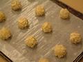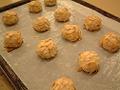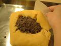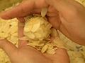アーモンドスライスをつける時は、まんじゅうにささらにようにつけます。ささって生地が破れてしまうと焼いた時に破裂してしまいますよ。