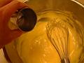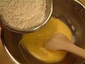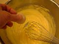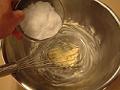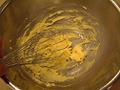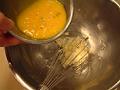 溶きほぐした全卵、卵黄を半量加え、溶きほぐすように混ぜる。全体に行き渡ったら、残りの上白糖と卵をその都度混ぜて、なじませながら加える。