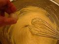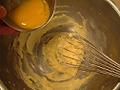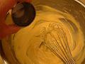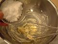 溶きほぐした全卵を半量加え、溶きほぐすように混ぜる。全体に行き渡ったら、残りの上白糖と全卵をその都度混ぜて、なじませながら加える。
