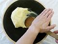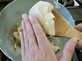 熱が入ると表面がぼそぼそとしてきます。かたくなったように見えますが、写真のように手に少しついてくるぐらいのかたさが目安です。