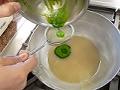抹茶を熱湯で溶き、茶こしでこしながら加える。
