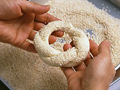 濡らした布巾を入れたバットに生地を置いて表面を濡らし、次に濡れた面を下にして、ごまを入れたバットに移してまぶすと作業が楽に行えます。