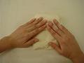 きれいな面を下にして、向こう側から3分の1折り返し、手のひらで全体を押さえる。生地の向きを180度変え、同様に行う。