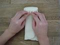 生地の向きを90度変え、向こう側の端を少し折り返して軽く抑える。表面が張るように、親指で生地を軽く締めながら、手前に向かって巻く。