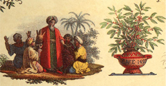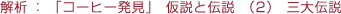 | 前半で紹介した、妄想に近い仮説・怪説と薬としての使用説に続いて、ここではコーヒー発見話の定番ともいえる三大伝説(私が勝手に命名しただけです)を取り上げ、話の出典と伝播、そして伝説の背景を考えてみます。 |