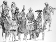 カフェ・プロコップが開業したのは1686年。プロコップはそれまでの店とは次元の違う豪華な内装で、明らかに上流階級(とその周辺の人々?)をターゲットにした店でした。プロコップが成功した大きな要因は、そうした人々に知的交流の場を提供したことにある、といわれています。それまで人々の交流の場は、閉鎖的なサロンか、キャバレやタヴェルヌのような酒場が主だったのですが、プロコップはきたるべき18世紀=「理性の世紀」にふさわしい新しい交流空間を提案しました。