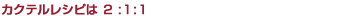 上記のカクテルの比率は酒2:リキュール(甘味)1:柑橘類(酸味)1。リキュールと柑橘類がジュースや生クリームに置き換わる場合もあり、この比率のカクテルは他にもたくさんあります。ベースとなるお酒には通常40度になるジンやラム、ウォッカなどが使われるので、それらの高いアルコール度を適度に調整するために飲みやすくなるのか、はたまた味わいのバランスが取れるのか、それとも単に覚えやすいのか・・・・答えはたくさんあるようですが、これを「カクテルの黄金比」と呼ぶのは行き過ぎでしょうか?