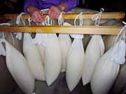 袋に詰めた新酒を吊り下げ、自然に搾ります。本醸造酒などはアコーディオン式の搾り器で左右から圧力をかけて搾りますが、今回の吟醸酒は重力だけで時間を掛けて搾っていきます。こうして搾ったものが原酒、袋に残るのが酒粕です。