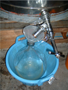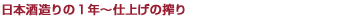 袋から流れ出てきた原酒を集めます。このあと火入れ(低温殺菌)をおこなってから、ビンに詰めて完成です。火入れは通常、貯蔵前と出荷前の2回おこないますが、生酒の場合は火入れはせず、原酒を濾過してビン詰めします。なお、原酒はそのままではアルコール度が高いので、通常は水を加えて希釈し、アルコール度を16度くらいに調整します。