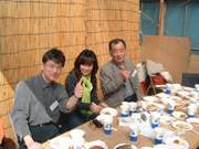 搾りが終わったら恒例のバーベキューです。搾りたてのお酒やその他のお酒もいただき、今年の田植え、稲刈りの苦労などを楽しく語らいます。1年の苦労が実ったためでしょうか、参加者はみんな笑顔です。