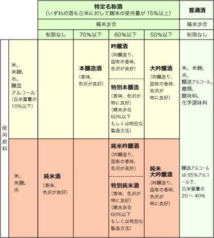 つまり、本醸造や吟醸、純米吟醸といった名称は、原料と精米歩合によって決まるのです。