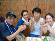 田植えが終わればバーベキューの開始です。山野酒造さんのお酒と一緒にお肉や焼きそば、おにぎりなどを頂きます。「おいしいお酒で疲れも吹っ飛ぶ!!」……わけがなく、帰りの電車では全員爆睡でした。明日の授業は大丈夫でしょうか??