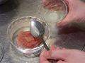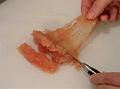 薄膜に切り目を入れ、端を手で持って、包丁の裏でこそげるようにして出します。