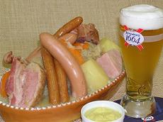 | シュークルートはフランスのアルザス地方の郷土料理です。塩漬けキャベツを野菜、ハムなどと一緒にブイヨンで蒸し煮にして作ります。ほどよい酸味と豚肉加工品のこくのある味わいがマッチして、ビールでもあればいうことなし!塩漬けキャベツはザワークラウトという名前で市販されていますので、ごく簡単に作れて、満足のある味に仕上がること間違いなしでしょう。 |