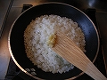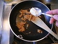 玉ねぎが茶色く色づいて甘味が出れば、小麦粉を加えて粉気をとばすように炒める。