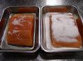 バットに1を少量ふり、その上にサケを置き、上から残りの1を全てかける(写真右)。これを冷蔵庫で8時間から12時間漬け込む(写真左が漬け込みの終わった状態)。
