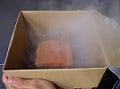 スモークウッドは炎こそ出ませんが、火はついているので特に底が熱くなります。庫内温度を下げるためにもスモーカーの一番底に氷をビニール袋に入れて敷き詰め、その上にスモークウッドを入れた容器を置くようにします。またダンボールが焦げないように、スモークウッドとの距離を最低5cm以上離してください。