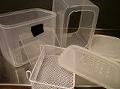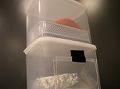 100円ショップで売っているパン用のプラスチック製密閉容器2つと、洗剤置き用の網を用意する。1つの容器は底を切り取り、もう1つの方にはスモーカーを出し入れする扉をつけ、蓋には穴をたくさん開ける。