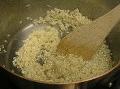鍋にバター20gを中火で熱し、玉ねぎのみじん切りをしんなりするまで炒め、米を加えてさらに炒める。