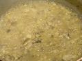 炒めたきのこを加え、鶏の出し汁を米が浸る程度に加える。乾燥ポルチーニ茸の戻し汁を加えて塩、こしょうで下味を付ける。