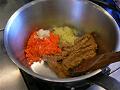 飴色になった玉ねぎを別鍋に移し、みじん切りにしたにんじん、セロリ、にんにくを加えて炒める。