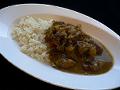 皿にバターライスを盛り、煮込んだ牛肉とソースをかける。