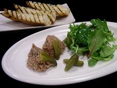 | ウサギや鴨でも良く作られるリエットは、元々さばいた骨などについていた肉の食べ方として発達したものです。ガラや身が少しついている骨を低温の油(ラードやガチョウの油)で長時間煮ます。肉が骨から簡単にはがれるようになれば肉をほぐし、煮込んだ油で固める。素朴なものです。 |