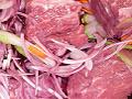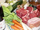 肉は5cmくらいの固まりに切り分ける。にんにくはひびが入るくらいに軽くつぶす。野菜はすべて薄切りにし、肉とにんにくと合わせる。