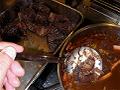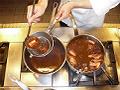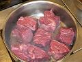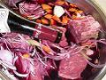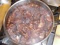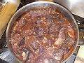 肉を鍋に戻し、漬け汁とフォン・ド・ヴォを加える。沸騰したらブーケ・ガルニを加え、ふたをして180℃くらいのーブンで2時間煮る。