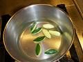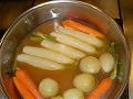 温める液体は特にこだわらないが、ポタージュスープくらいの塩味はつける。薄めの鶏の出し汁、または湯を沸かしてスプーン1〜2杯程度の9のソースを加えて風味をつけながら温めると良い。