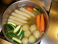 ズッキーニはフットボール型にむき、塩ゆでする。