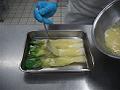 ステンレスかホーローの容器、またはタッパーなどに粗熱の取れたねぎを並べて、塩、こしょうとドレッシングをたっぷりとかけて漬け込む。