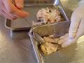内側から丁寧に骨を取り外し、皮、肉、筋をバットに取り出して急速に冷やす。