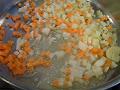 鍋にバターを溶かし、玉ねぎ、にんじん、セロリ、にんにくを炒める。