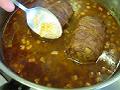 赤ワインが沸騰すればトマトジュースとベーコンで包んだ豚足を加えて軽く煮る。
