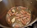 鍋にサラダ油、ベーコン、にんにくを入れて火にかける。