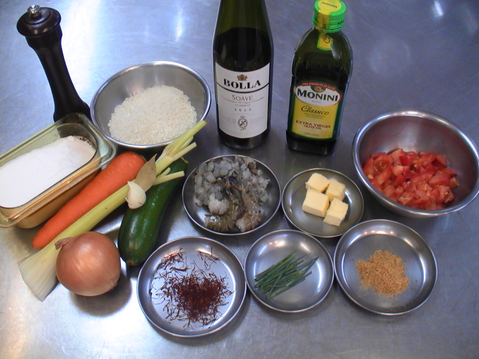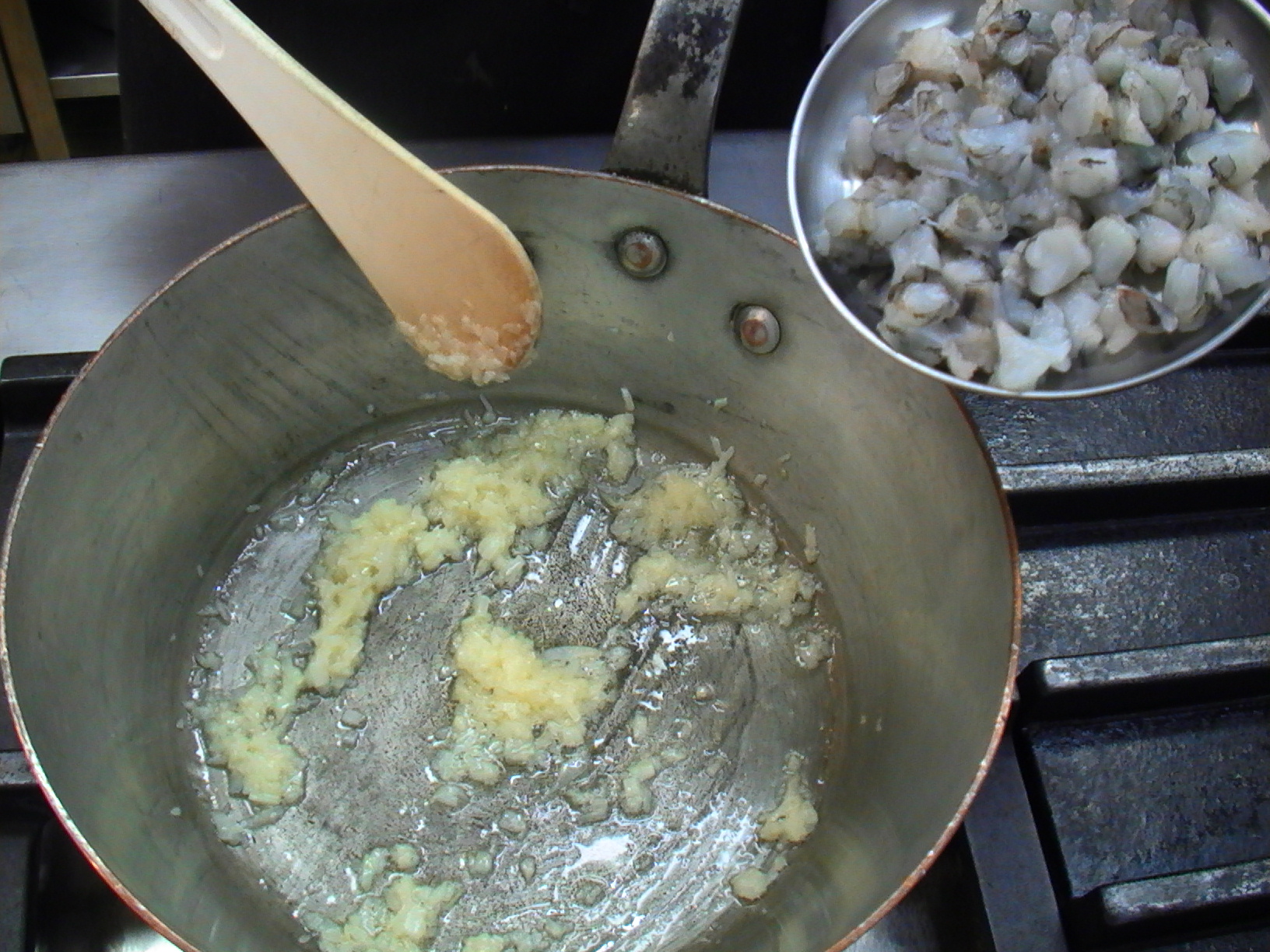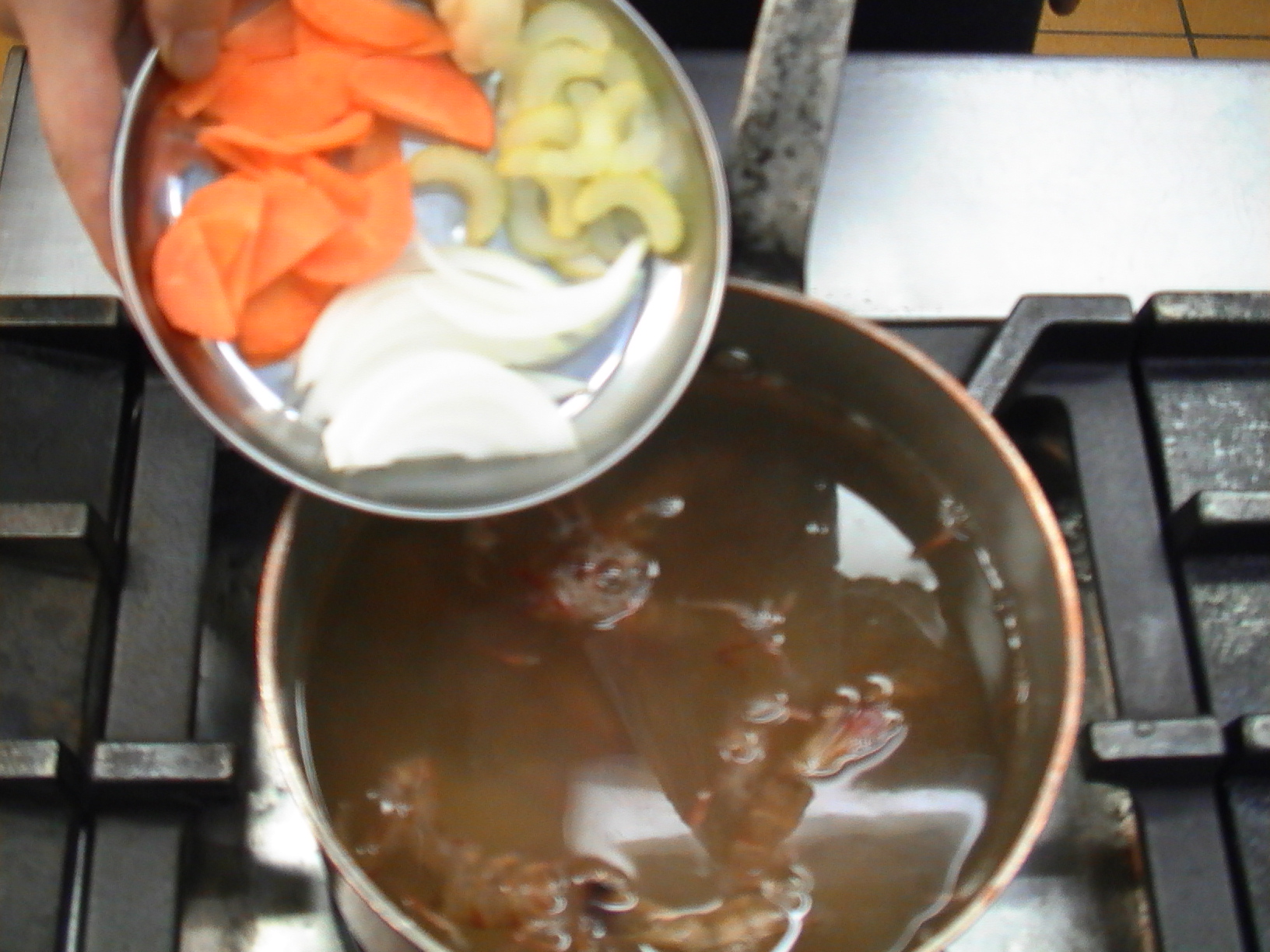 鍋に水、チキンブイヨンを入れて沸騰させる。エビの殻、薄切りにした玉ねぎ、にんじん、セロリ、叩き潰したにんにく、角切りにしたトマト、ローリエを加え、30分ほど煮込む。こし器で漉す。