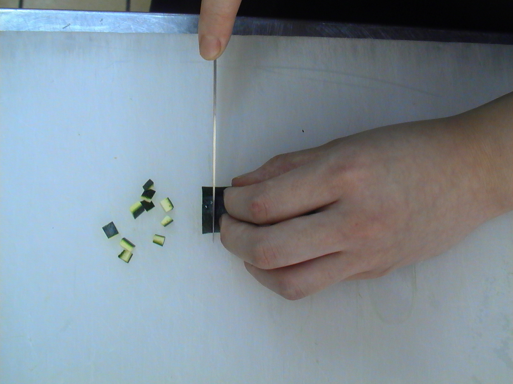 水洗いしたズッキーニを6〜7mmほどの小さな角切りにする。