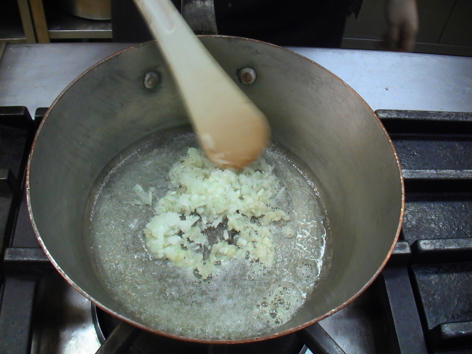 鍋にバター20gを入れて火にかける。バターがとけてきたら、みじん切りにした玉ねぎを加え、しんなりするまで炒める。