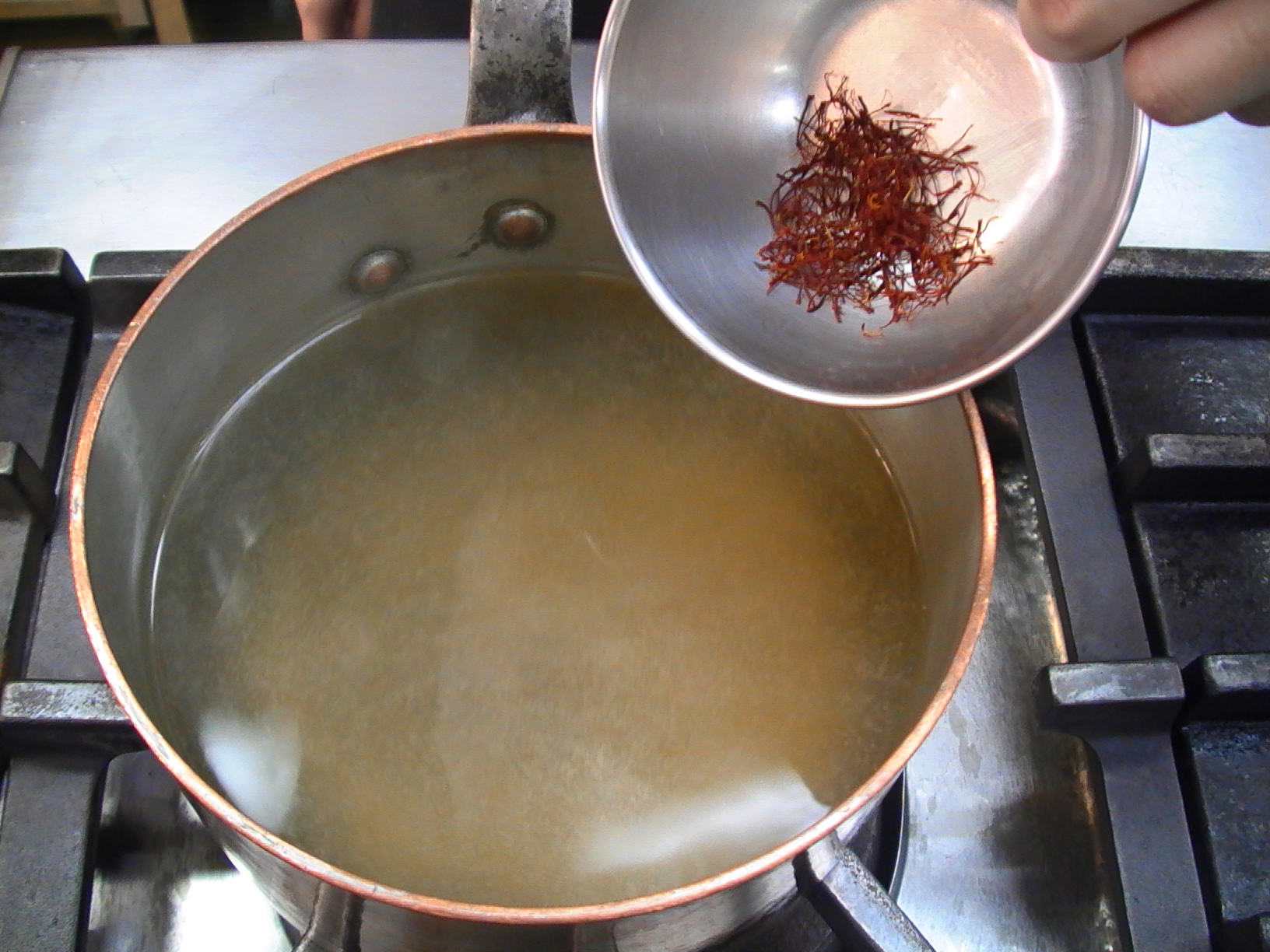 サフランを加え、さらに5分ほど煮込む。香りと色がつけば、こし器でこす。