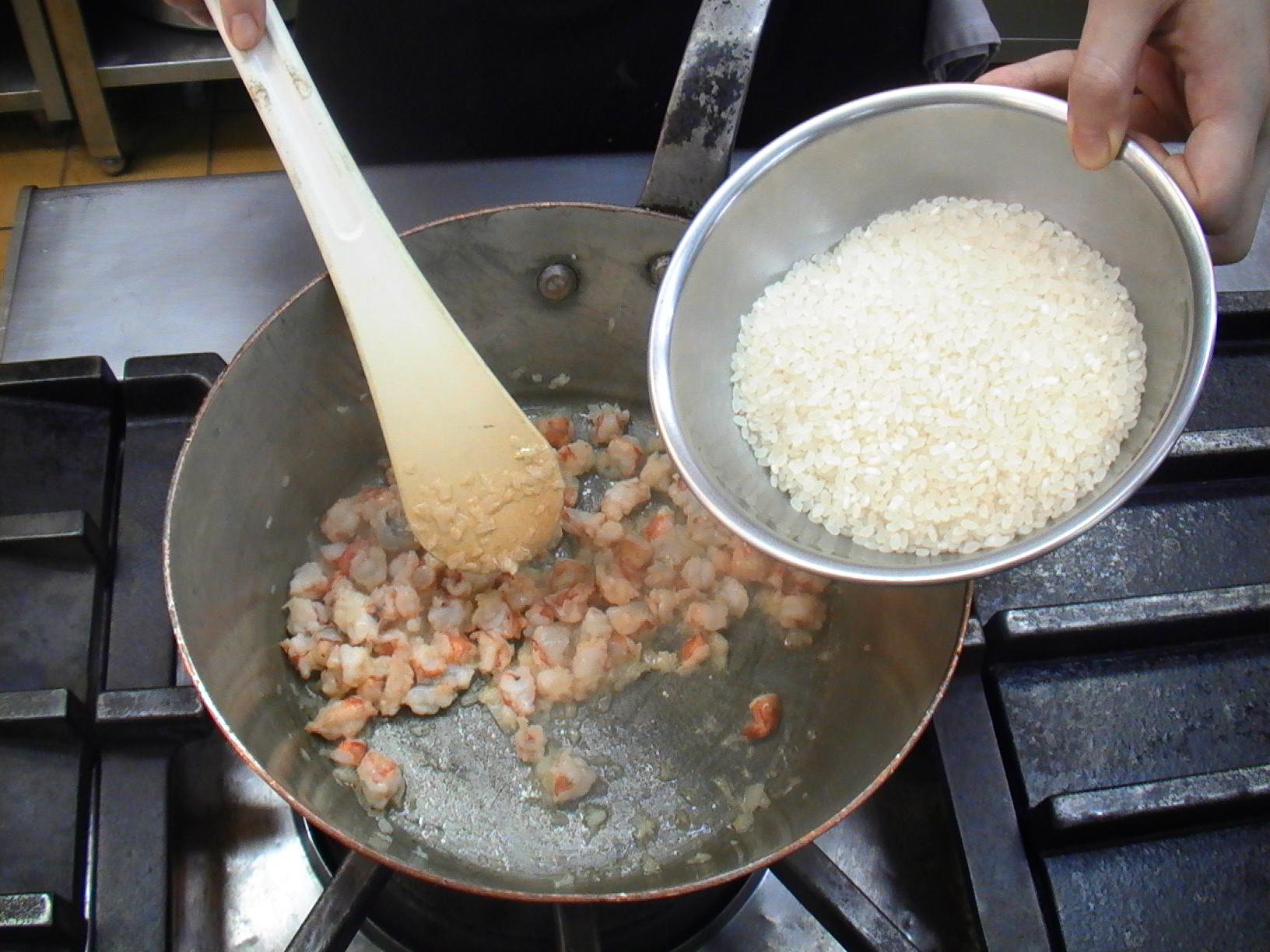 玉ねぎ、エビが炒まれば、米を加え、表面が軽く透き通るくらいまで、しっかり炒める。