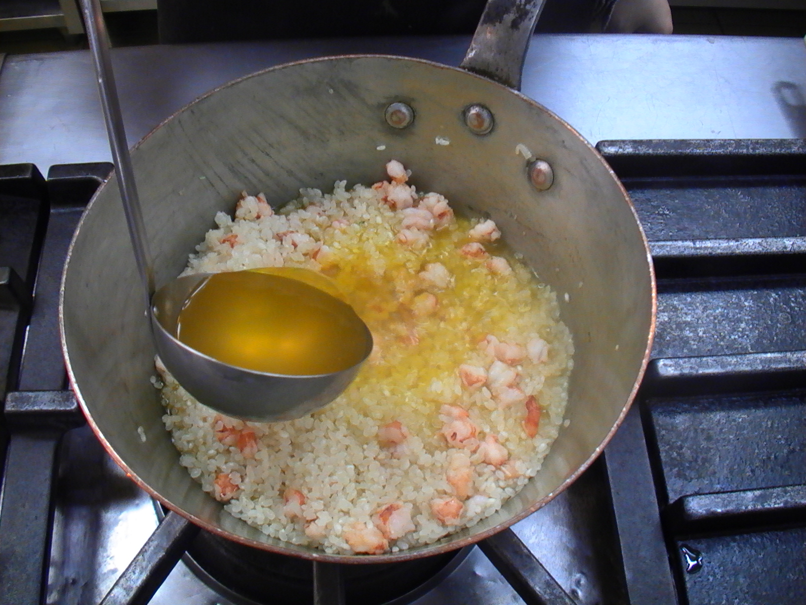 米が炒まれば、白ワインを加え、アルコール分をとばします。だし汁を加えながら、17〜18分煮ていきます。