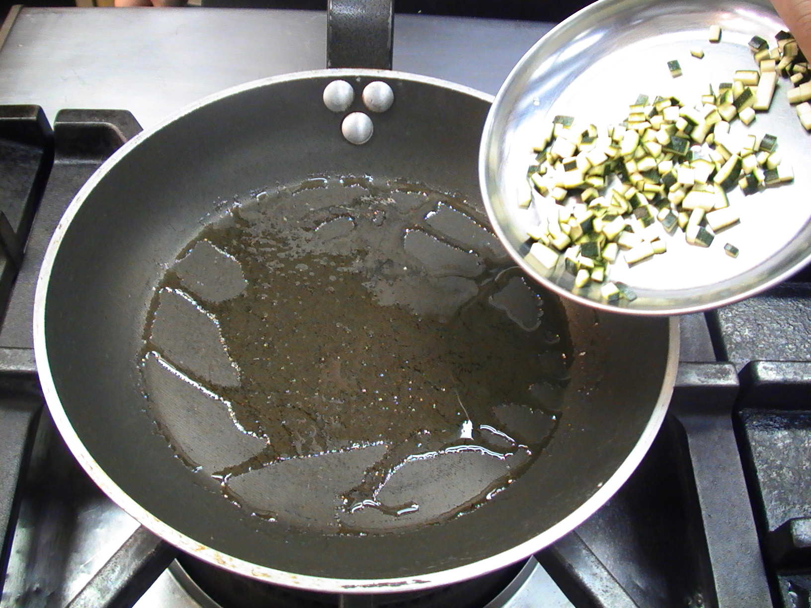 フライパンにオリーブ油を熱し、角切りにしたズッキーニを入れ、炒める。塩、こしょうで味を調え、ステンレス皿に移す。