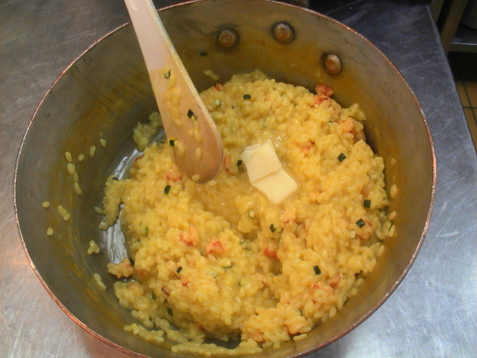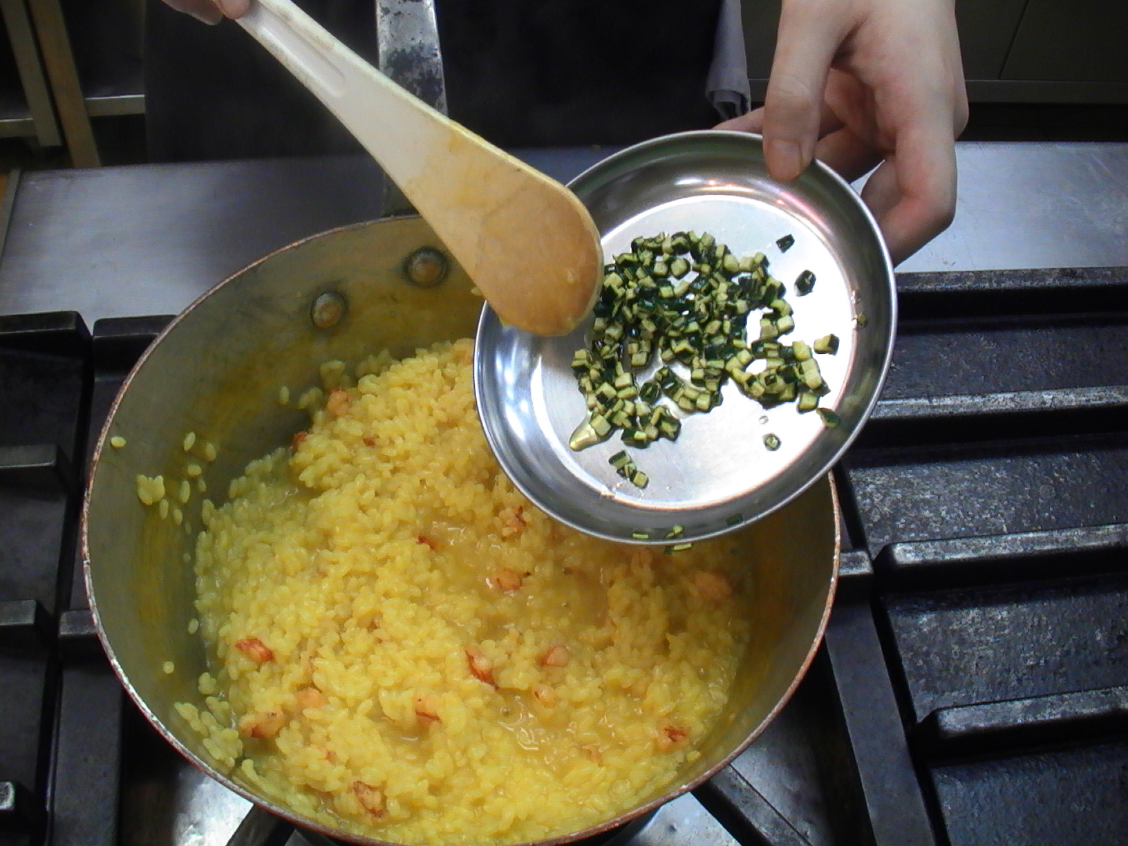 リゾットが煮あがれば、ズッキーニを加え、塩、こしょうで味を調える。