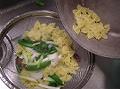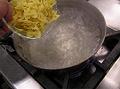 パスタの標準ゆで時間の3分前になれば、スナップえんどうと玉ねぎを加える。