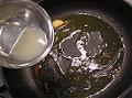 輪切りとうがらしに軽く火が入れば、アサリの煮汁を加える。