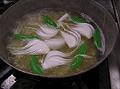 葉付き玉ねぎは掃除してくし型に切り揃える。